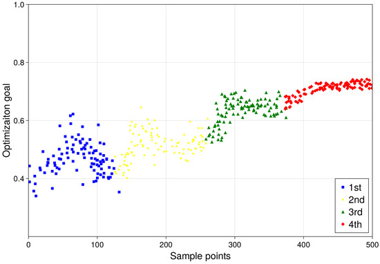 The first generation of optimization rapidly identifies local optima using the Nelder–Mead (NM) method. To escape these local optima and pursue a global optimum, the simulated annealing (SA) method introduces probabilistic jumps, as demonstrated in Figure 6. This figure shows how objective function values evolve, indicating a convergence of optimization efforts by the third generation.