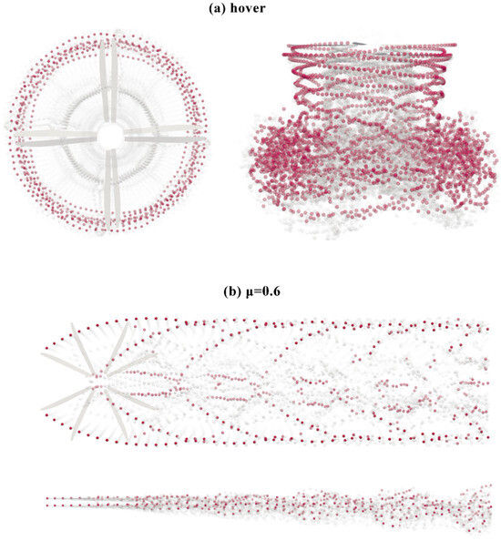 Figure 7 shows the vortex particle wake field distribution of the X2TD-like rotor established in this paper during the optimization initialization stage. Calculations were performed for both hovering and = 0.6 forward flight states. It can be observed that, in the hovering state, the lower rotor is immersed in the wake field of the upper rotor, experiencing severe interference. At the high-speed forward flight state of = 0.6, due to the small spacing between the upper and lower rotors of the coaxial rigid rotor, there is still some interference in the wake field, but the degree of mutual interference is much less than in the hovering state. Additionally, due to the high forward flight speed, the wake is rapidly blown towards the rear of the rotors, and thus the wake’s induced effect on the rotor plane is much weaker compared with the hovering state.