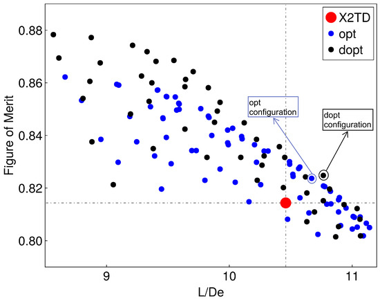 The selection of the ‘opt’ and ‘dopt’ configurations from the Pareto front was a critical step in the optimization process. Initially, configurations surpassing the baseline X2TD design in both the hovering and the forward flight were identified. These promising configurations, located in the upper-right region of Figure 8, indicated potential for enhancing both key performance metrics. To select the final configurations, these candidates were evaluated using the weighted objective function defined in Equation (13). This function integrates and , with weights derived from previous research and tailored to prioritize high-speed flight performance, a key focus of this study. The ‘opt’ and ‘dopt’ configurations, boasting the highest weighted objective function values, were ultimately chosen. This selection represents a strategic balance between maximizing hover performance and optimizing cruise efficiency. While the ‘opt max’ and ‘dopt max’ configurations represent the theoretical maxima of the combined objective function, they were not selected due to potential drawbacks. Their extreme nature could introduce undesirable trade-offs in other performance aspects or pose practical limitations in real-world applications. The chosen ‘opt’ and ‘dopt’ configurations, while not maximizing any single metric, offer a more balanced and pragmatic approach to performance enhancement, aligning with the broader goals of this research.