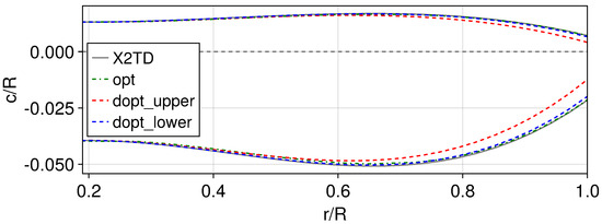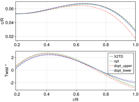 Figure 9 presents a comparison of the planform shapes of the blades corresponding to the opt configuration and dopt configuration with X2TD, while Figure 10 shows the optimized blades’ spanwise chord length and twist distribution. It can be observed from the figures that the optimized blade shapes retain the elliptical planform shape and nonlinear twist distribution of the original X2TD blades. The dopt configuration exhibits significant differences in the planform shape of the upper and lower rotors beyond 0.6 R; the upper rotor has a greater taper ratio, while the lower rotor’s shape is closer to X2TD. In contrast, the planform shape of the blades in the opt configuration is similar to X2TD, but the chord length between 0.3 R and 0.9 R is smaller than in X2TD. Regarding the twist angle, the upper rotors of both the opt configuration and dopt configuration have similar values, with a greater range of twist changes compared with the lower rotor of the dopt configuration and the X2TD.