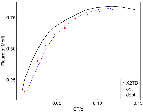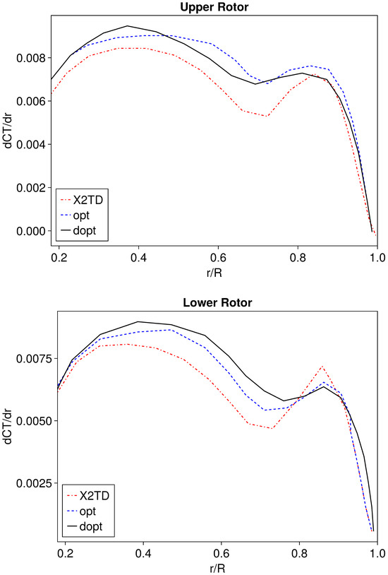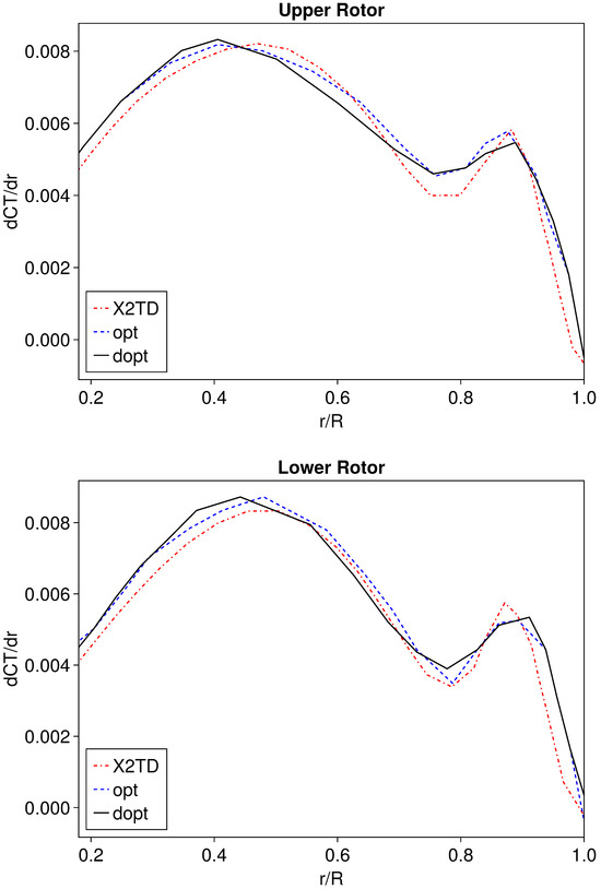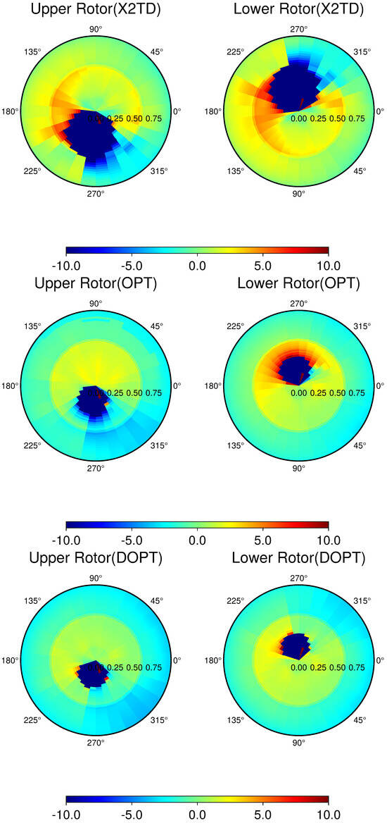 Figure 11 illustrates that the optimization result with identical blade designs for both rotors achieves better hovering efficiency around the target blade loading coefficient compared with the X2TD baseline. However, in the lower thrust coefficient region, the performance of the opt configuration is relatively average. In contrast, the dopt configuration, with different blade designs for the upper and lower rotors, shows better performance across the entire thrust coefficient range. This improvement is likely due to the differential design mitigating the aerodynamic interference of the upper rotor on the lower rotor, thereby effectively enhancing the coaxial rotor’s hovering performance.