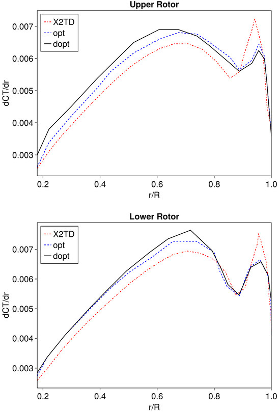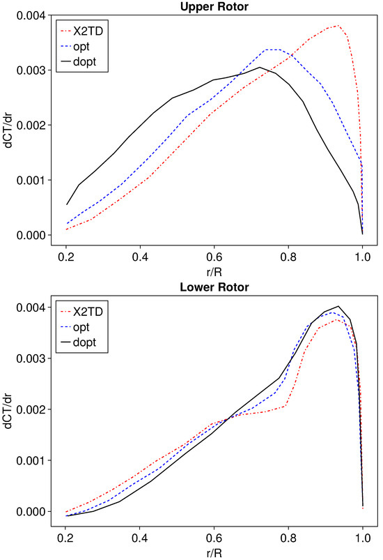 Figure 15 shows that, at an advance ratio of 0.35, the peak value of the thrust coefficient for the upper rotor of the X2TD is more biased towards the outer side and more evenly distributed compared with the opt and dopt configurations, with smaller differences observed among the lower rotors of the three configurations, resulting in a slightly better lift-to-drag ratio for the X2TD configuration.