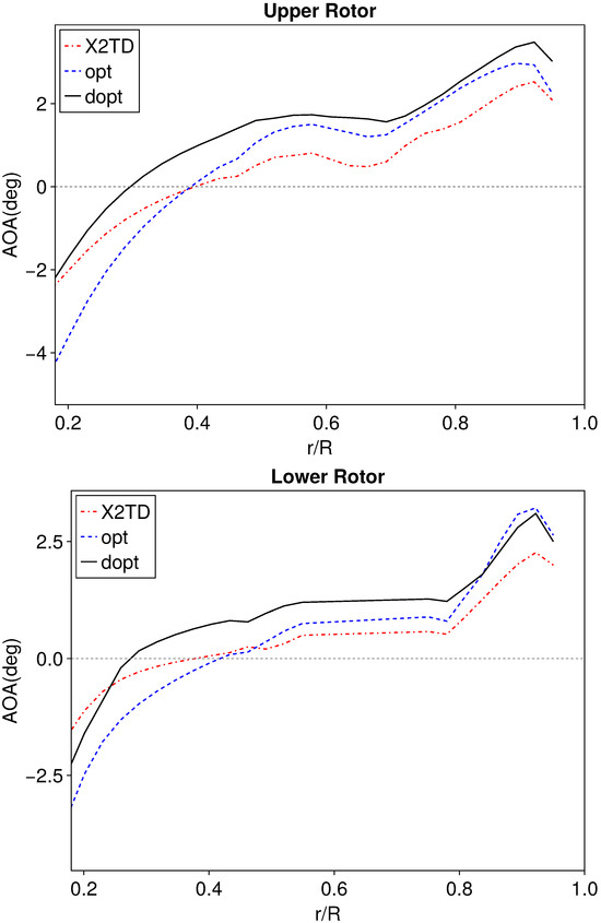 Figure 13 shows the radial distribution of the blade aerodynamic angle of attack for the X2TD baseline, opt, and dopt configurations in hover. For the upper rotor, the dopt configuration exhibits the smoothest angle of attack distribution, consistently maintaining a higher angle of attack than the other two configurations. The opt configuration has a relatively steeper angle of attack distribution in the inner region, but, in the outer region, where most of the lift is generated, its angle of attack is smoother and higher than the X2TD baseline. Considering that the X2TD baseline configuration has a wider chord length in the outer blade section, this result is consistent with the spanwise distribution of the blade thrust coefficient. For the lower rotor, a noticeable fluctuation in the angle of attack is observed near 0.8R, attributed to the significant interference from the upper rotor, which is also reflected in the fluctuation of the thrust coefficient at a similar location in Figure 12. Moreover, the lower rotor of the dopt configuration still maintains a smoother angle of attack distribution, but near the blade tip its distribution is closer to that of the opt configuration. This is likely because the chord length distribution of the lower rotor is more similar to the opt configuration.