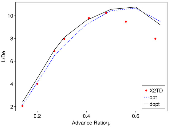 Figure 14 shows that, before the advance ratio reaches 0.3, the interference between the upper and lower rotors is relatively significant. In this phase, the dopt configuration, due to its differential blade design, exhibits slightly superior forward flight performance compared with the X2TD and opt configurations. As the advance ratio increases (between 0.3 and 0.5), the interference between the rotors diminishes, and the lift-to-drag ratios of X2TD and opt configurations gradually rise, slightly surpassing the dopt configuration. Beyond an advance ratio of 0.5, the lift-to-drag ratio performance of X2TD blades evidently lags behind the opt and dopt configurations, possibly due to the X2TD blades being designed with a focus on performance at a specific speed (such as = 0.5), while this study emphasizes performance at = 0.6.
