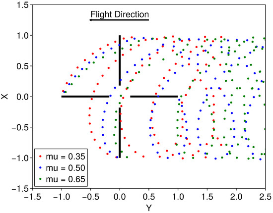 Figure 18 shows the overhead view of the wake structure of the upper rotor tip vortexes of the X2TD at different advance ratios. As seen in the figure, with increasing forward flight speed, the tip vortex wake of the rotor rapidly moves rearward under the influence of the forward inflow, causing the tip vortex of one blade to significantly interfere with the outer segment of the subsequent blade. The higher the advance ratio is, the more the area of interference contracts inward, corroborating the trough phenomenon in the blade-loading coefficients observed in Figure 15, Figure 16 and Figure 17.