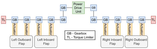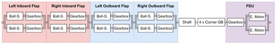 Figure 1 shows a detailed schema of the state-of-the-art architecture for flaps. Each flap surface is deployed by two actuators that are connected to the main shaft through the correspondent gearboxes. Two extra gearboxes per wing are typically located between the power drive unit and the first actuator in order to redirect the main shaft through the fuselage and wing []. Two torque limiters are located at the wing tips. All actuators are linear ballscrews. State-of-the-art slats are built following the same schema. A specific figure for slats is avoided to avoid unnecessary repetition. The only difference is that slats have a larger number of surfaces. Following the example in Figure 1, the slats have ten slat surfaces (five per side) instead of four flat surfaces (two per side). The rest remain the same, which means that there is one main PDU, two ballscrew actuators per surface and two torque limiters in total.