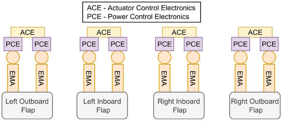 Figure 2 shows the scheme of this innovative architecture with all the components involved. It can be seen how the central components (i.e., main shaft and PDU) disappear. Now every flap surface is independent from the others. Each surface still has two actuators connected to it; however, these actuators are now electromechanical ones. The ballscrew actuator, motor and power control electronics are condensed into one single component or unit. Two of these units are present per flap surface, and each of these couples requires an actuator control electronics (ACE) unit. This unit guarantees correct and symmetrical deployment of the flap surface, avoiding panel twisting. These units are connected to the flap/slat control computers, which allow communication among all ACE and ensure that asymmetries are neutralized. As for the conventional architecture, slats are built in the same way as flaps. The only difference resides in the number of slat surfaces. Flaps have four flap surfaces (two per side); slats typically have ten slat surfaces (five per side). Each slat surface is also composed of two EMAs, each of them connected to their correspondent PCE, both connected to ACE. A specific image for slats is avoided since it is redundant, and the only difference compared to Figure 2 is the number of surfaces (four compared to ten).