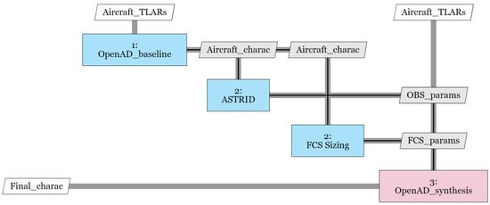 All these steps are represented in Figure 3 as an extended design structure matrix. Blocks represent the tools, vertical lines indicate the inputs and horizontal ones the outputs. Thanks to this diagram, the user can quickly understand how the information is exchanged among the different tools and what the running order is. The whole workflow starts from block 1. Some TLARs are given as input to an overall aircraft design tool (OpenAD in this case, but other tools can be used). The results are the aircraft characteristics such as an initial MTOM, wing surface, fuselage length, engine thrust, etc. These results allow the on-board systems to be sized more precisely. ASTRID is used for this purpose and provides as a result the masses, power off-takes and bleed for the given architecture in the given aircraft baseline. The dedicated FCS tool works the same way but is focused only on this system. Once all the masses, off-takes and bleed are summarized, they can be given back to OpenAD. This provides a more precise aircraft baseline with higher-fidelity results based on the specific OBS architecture. Consequently, values such as the final MTOM or fuel burn can be obtained for each of the architectures.