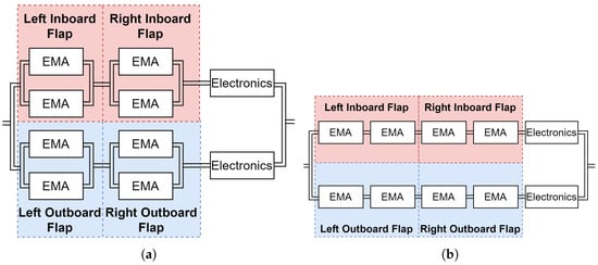 The RBD in Figure 4 with the corresponding failure rates provides a value of probability of failure for the conventional architecture of . The innovative architecture from Figure 2 can be represented the same way. For this case, the PDU, gearboxes and shaft are not present so the RBD contains only EMAs in parallel and electronics in series. With this configuration, the results for the innovative architecture for flaps has a probability of failure of , which is higher than the conventional one. This comparison should not be taken as exact since the results are hugely dependant in this case on the failure rates of the shaft and electronic components. Slight variations on these estimations massively affect the results. The main outcome is that both architectures have the same order of magnitude, and the one that performs best is determined by the failure rates (and hence the quality) of the components involved. This result is not the main outcome of this analysis. As explained before, the main advantage of the innovative architecture relies on the increase in operational reliability. This comes from the idea that removing the main shaft and mechanically disconnecting the surfaces allows them to be independently deployed []. This results in a completely different reliability block diagram in which the inboard and outboard flaps are in parallel and not in series as for the conventional case. The new RBD for the innovative architecture is shown in Figure 5. In can be noticed that two RBDs are obtained. One represents the case in which the actuator never suffers jamming, the other shows the case in which the actuator jams every time it suffers a failure. Both cases are extreme and not real for current EMAs, but knowing both sides gives some insights into the potential of the architecture.
