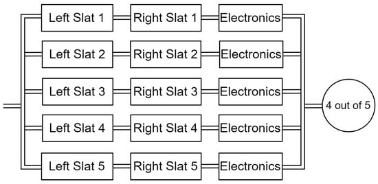 The increase in operational reliability is seen directly in the RBDs since the inboard and outboard flaps go from a series to a parallel configuration. Deploying only one of them fulfills the mission. Slats work the same way but have a larger number of surfaces. As said before, the reference aircraft has two flap surfaces and five slat surfaces per wing. For the conventional case, all five slats are in series in an analogous RBD as shown in Figure 4. The main difference is that there are five surfaces instead of two. When switching to an innovative architecture, a question arises. This issue regards the amount of slat surfaces that need to be successfully deployed in order to consider the mission as fulfilled. For this case, in order to stay conservative, only one slat surface is allowed to fail, hence, fulfilling the mission if four out of five slats are deployed. The resulting RBD is shown in Figure 6.