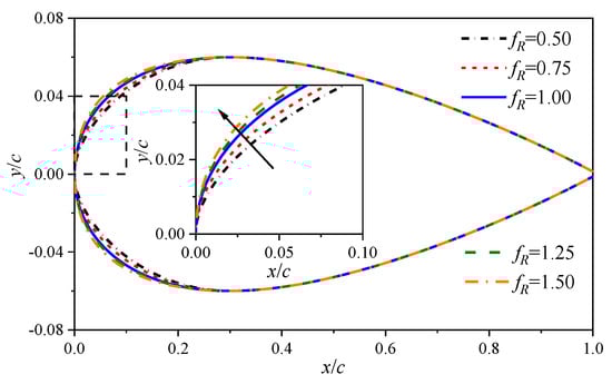 The leading edge radius of the baseline NACA 0012 airfoil Rle,bl = 0.0159c. The leading edge radius of the four morphed airfoils is 0.5 Rle,bl, 0.75 Rle,bl, 1.25 Rle,bl, 1.5 Rle,bl, with a scaling factor of fR = 0.5, 0.75, 1.25, 1.5, respectively. fR = 1.0 denotes the baseline airfoil. The comparisons of NACA 0012 and the four morphed airfoils are shown in Figure 1.