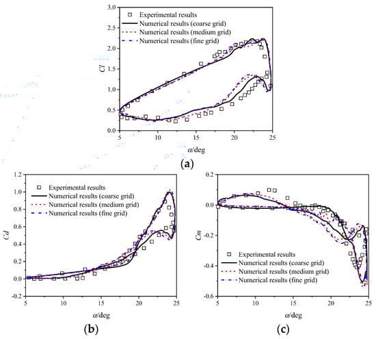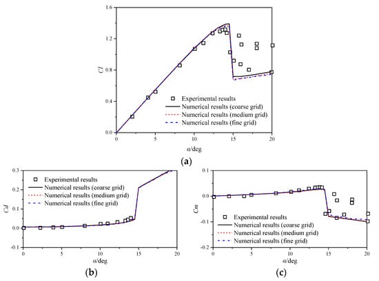 Comparison between the numerical and experimental airloads []: (a) Cl; (b) Cd; (c) Cm.