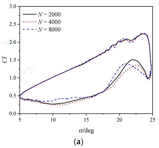 The NACA 0012 airfoil is subjected to a pitching motion with an angle of α = 14.91° + 9.87° sin(ωt), a reduced frequency of k = 0.151, a Mach number of Ma = 0.283, and a Reynolds number of Re = 3.45 × 106. Figure 4 compares the numerical results obtained from three time steps based on the medium grid. Figure 5 compares the numerical results obtained from three grids and experimental data []. The IDDES method overpredicts the stall angle and peak values of drag and nose-down pitching moment. The numerical results bear a high degree of similarity during the pitching-up stage. Some discrepancies are observed during the recovery stage, which is acceptable for the purpose of this research. Overall, the numerical results exhibit a favorable agreement with the experimental results. The results of these validations demonstrate the effectiveness of CFD methods for the analysis of stall behaviors in both static and pitching airfoils.