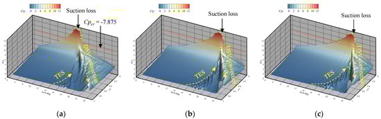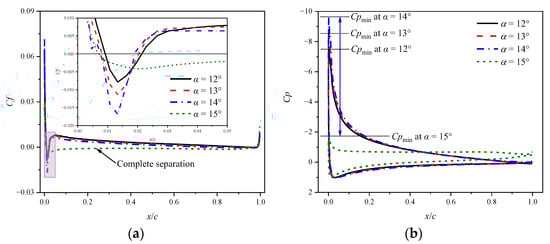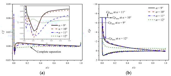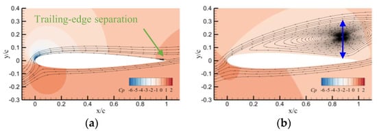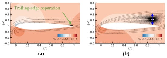 For the airfoil with fR = 0.50, localized leading edge separation is observed at α = 9°, as shown in Figure 7a. As AoA increases, the separation point moves upstream and the suction pressure peak increases, as shown in Figure 7b. When the airfoil exceeds the stall angle, a sudden and complete flow separation occurs, causing an abrupt drop in the suction pressure peak. As a result, stall events such as the lift stall, drag divergence, and pitching moment divergence arise.