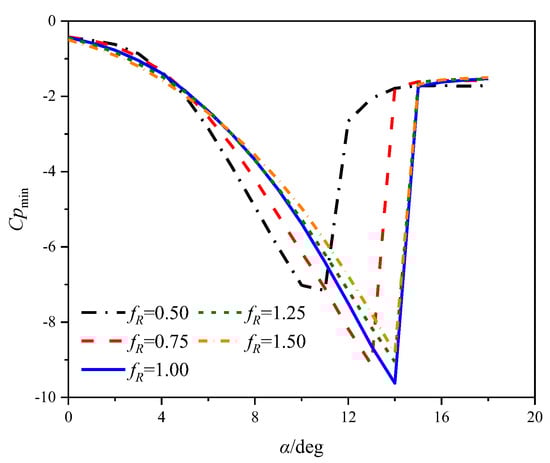Figure 13 illustrates the relationship between the minimum pressure coefficient and the AoA. An increase in leading edge radius results in a slower increase in the amplitude of the suction pressure peak with respect to AoA.