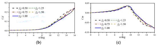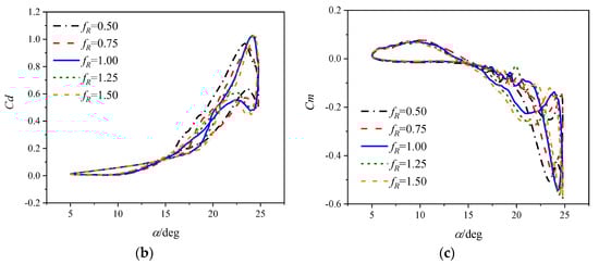 The simulations of the static airfoils are conducted at a Mach number of 0.283 with a Reynolds number of 3.5 × 106. Figure 6 displays the aerodynamic force coefficients of the airfoils. The leading edge radius has little influence on the lift slope but significantly affects the static stall characteristics. Increasing the leading edge radius delays the lift stall, drag divergence and pitching moment divergence. Moreover, the maximum lift coefficient shows an increasing trend with increasing leading edge radius, but at a very small rate when fR > 1. When AoA exceeds the stall angle, the airfoil encounters a sharp decline in lift coefficient, while a rapid rise in drag and nose-down moment coefficients, indicating an abrupt stall.
