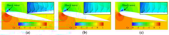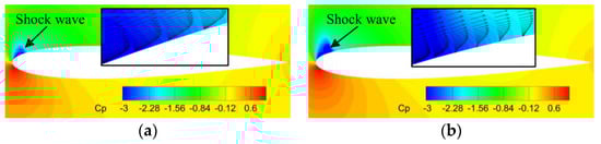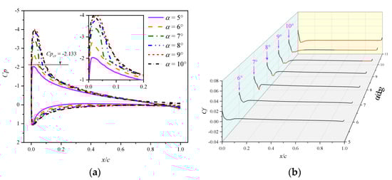 Figure 16a displays the pressure coefficients of the NACA 0012 airfoil at various AoAs. The critical pressure coefficient Cpcr obtained from the isentropic relation is also shown in the figure. As the AoA exceeds 5°, the pressure coefficient near the leading edge starts to exceed the critical value, indicating the occurrence of local supersonic flow. When the AoA reaches 7°, a shock wave is observed at the leading edge. With increasing AoA, the extent of supercritical flow increases and the shock wave moves downstream and strengthens. However, when the AoA reaches 10°, the shock wave starts to move upstream. The pressure behind the shock wave also decreases.