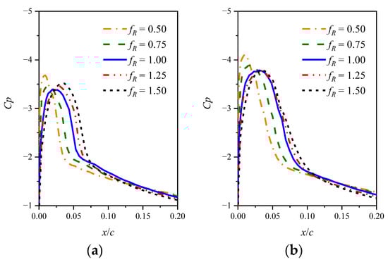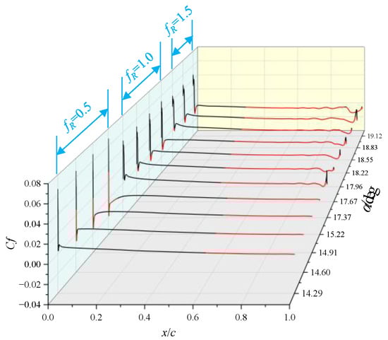 Figure 19 illustrates the pressure coefficients and skin frictions for the airfoil with fR = 1.50. The critical pressure coefficient Cpcr is also shown in Figure 19a. The stall process of the airfoil is similar to that of the NACA 0012 airfoil. Additionally, the other three airfoils with fR = 0.50, 0.75, and 1.25 undergo the same stall process. The results suggest that modifying the leading edge radius does not change the shock-induced stall regime.