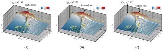Figure 25a shows the spanwise averaged pressure coefficient near the collapse of the suction pressure peak in the vicinity of the leading edge. No visible shock wave is observed, despite the existing local supersonic flow near the leading edge. The high adverse pressure gradient near the leading edge is the main cause of flow separation.