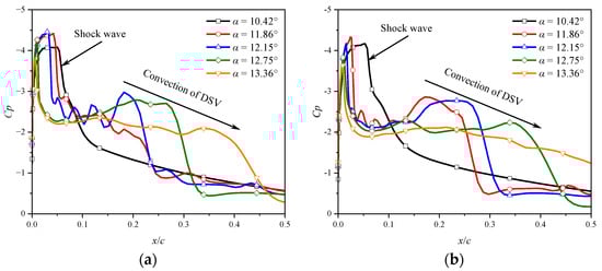 Figure 30a shows the spanwise averaged pressure coefficients of the NACA 0012 airfoil at α = 10.42°, 11.86°, 12.15°, 12.75°, and 13.36° in the pitching-up circle. At α = 10.42°, flow separation induced by a shock wave is observed near the leading edge, as mentioned above. As the AoA is increased from 10.42° to 11.86°, the shock wave starts to move forward, and the pressure behind the shock wave fluctuates and decreases. As the AoA reaches 12.15°, a local negative pressure peak is observed behind the shock wave and moves downstream with further increases in AoA. This indicates the formation and convection of the DSV.