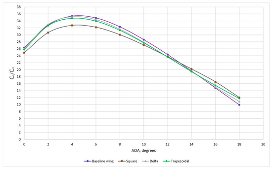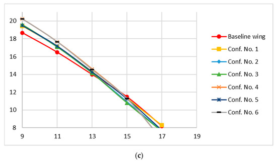 Aerodynamic efficiency: Aerodynamic efficiency (CL/CD vs. AOA) is the most significant parameter with which to assess the aerodynamic performance. The aerodynamic efficiency of all six winglet configurations is compared with the baseline wing in Figure 18 (the two lower parts of Figure 18 are illustrating zoomed in regions of 0 to 9 and 9 to 18 degrees AOA for better readability of the results). The main objective of implementing the winglets on the UAV wing was to gain the aerodynamic advantage at lower angles of attack, as MVGs enhanced the performance only at higher angles of attack, in addition to the delayed stall. Configuration 4 and 6 improved performances relatively better than all other configurations. The decrease in performance is only after the stall angle (14°), which is irrelevant.