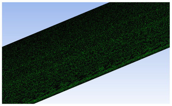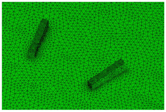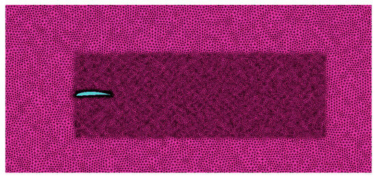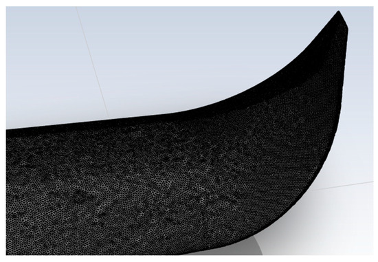 For the computational analysis, the grid scheme for the final wing design was similar to the one developed for the winglets’ investigation. The main task was to accommodate the mesh for the installed MVGs. For this, mesh density was significantly increased near the MVG regions, due to which the number of elements had to be increased from 10 M to 25 M. Figure 25 depicts the surface meshing of the wing. Due to the extremely dense mesh and small size of MVGs, capturing the mesh around MVGs precisely was difficult without losing the figure quality. The zoomed-in view of the grid strategy around the MVGs is given in Figure 26.