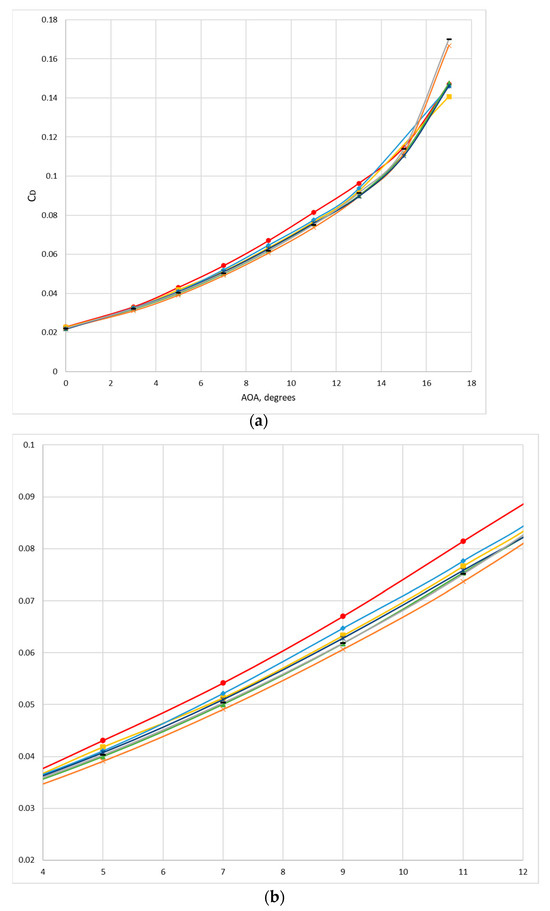 CD Vs. AOA graph of the baseline wing and different winglet configurations; (a) shows overall trends, while (b,c) show their respective AOA regions (4–12° and 12–17°) for better reader perception.