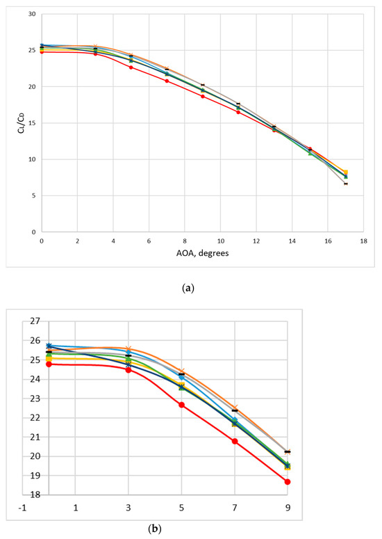 For the aerodynamic performance, the results of all the winglet configurations were compared. Winglets’ efficiency was mainly analyzed using the same parameter as for the MVGs (Figure 7), aerodynamic efficiency of the wing (CL/CD ratio). The winglets’ aerodynamic performance is compared here: