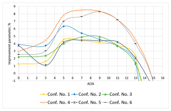 The results retrieved after applying Equation (3) are demonstrated in Figure 19. For the assessment of the performance improvement, the baseline wing’s performance was taken as the standard; hence, it was considered as the baseline of performance improvement (placed at the origin as the horizontal axis). The improvement in performance (percentage increment) is highest in the winglet configuration 4 across all AOA regimes. Interestingly, in configuration 6, the flow divider (installed on the winglet of configuration 4) did not provide any significant performance improvement compared to configuration 4. The flow divider was installed to further weaken the wingtip vortex strength; however, this was in vain. At the 4° angle of attack (the cruise angle of the 4R-UAV), the performance improvement of the configuration 4 was 6%, and the maximum performance improvement of nearly 8.5% was observed at 8° angle of attack.