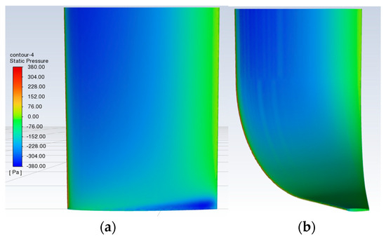 Pressure distribution contours over the suction sides of the baseline wing and winglets are shown in Figure 22. Pressure distribution near the wingtip of winglets is more even compared to the baseline wing. Winglets offered higher pressure at the tip region compared to the baseline wing, which led to lower pressure gradients between suction and pressure sides where the vortex is less intensive. Baseline wing pressure drops due to a strong vortex and its localized features closer to the wingtip trailing edge results in a slightly higher lift coefficient than for winglets but, at the same time, the drag coefficient had also decreased, with an exceeded rate than that of the lift.