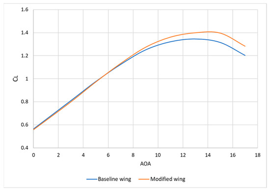 Comparison of the baseline and final wing lift coefficient trends.