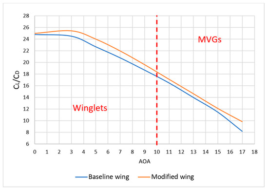 Comparison of aerodynamic efficiency between baseline wing and MVGs.