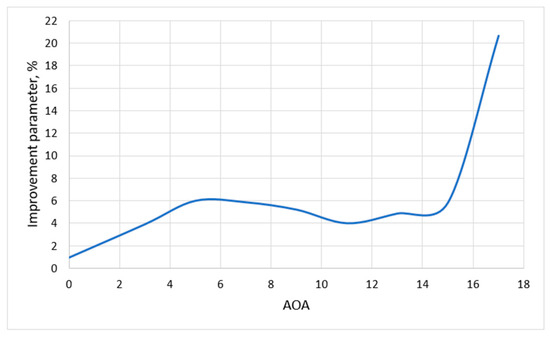 Similar to the winglet cases, the non-dimensional improvement parameter described in Equation (3) was used for the numerical assessment of the performance enhancement of the final wing. Figure 31 illustrates the improvement percentage of the final wing with respect to the AOA. Compared to the baseline wing (horizontal line at 0%), a stable and continuous performance improvement can be observed at all angles of attack. The maximum improvement is within the 3–6° AOA range (up to 6%), which means that the cruise angle 4° of the planned UAV will fall in the main performance improvement zone. One important fact that needs to be explained is the sharp rise in the performance improvement parameter near the stall region. The stall angle of the final wing was delayed from 13° to 15° and, due to this reason (at 15°), the performance jumped to a much higher value as, by that time, the baseline wing had already stalled. This delayed stall and increased near-stall performance can be useful in special missions or situations where safety and maneuverability are essential. In such conditions, a UAV will stay stable for an extended time, especially in extreme flight conditions, such as sudden wind gusts.