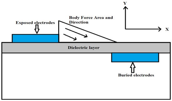 The plasma discharge excitation is a complex problem involving multiple physical processes and multiple temporal and spatial scales. To accurately analyze the reaction process, a large amount of computational resources is required, which makes the complete resolving of the process impractical. Therefore, a semi-empirical plasma model is commonly adopted in most flow control studies. In this study, the employed numerical model of AC DBD plasma excitation was based on the semi-empirical model developed by Shyy [21], where the impacts of plasma excitation on the flow field are treated as a triangular distribution of volumetric forces. Figure 1 illustrates the distribution of the volumetric forces in the field.