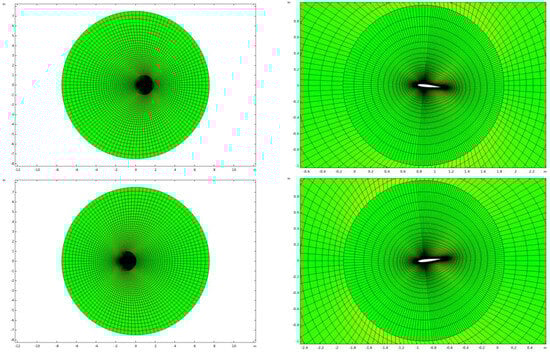 In this study, an O-type structured mesh (Figure 2) was employed for the external flow field of the NACA0012 airfoil. It consisted of two domains: the internal pitch and external deformation domains. Encryption treatment was then applied to the plasma excitation positions on the airfoil surface and boundary layer mesh. During the stable operation of the rotor blade profile, the relative incoming flow velocity and angle of attack underwent periodic variations. The periodic variation of the former was simulated by collective deformation to the left and right in the deformation domain. Throughout the process of external structured grid deformation, the interfaces between the internal pitch domains remained connected, and the pitch and deformation domains synchronously moved back and forth to replicate the periodic variation of the incoming flow velocity on the airfoil surface. In addition, within the internal pitch domain, both the mesh and airfoil followed Equation (12) for pitch motion. The center of rotation for the pitch motion of the airfoil was located at 0.25c, and it adhered to the following formula:
