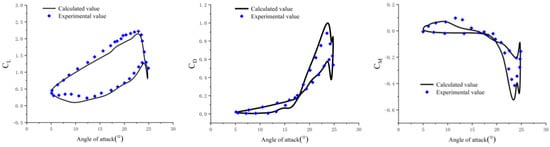 It can be observed that the computed airfoil aerodynamic coefficients and the experimental ones had the same variation trend. The variations in the aerodynamic forces near the stall angle of attack were accurately captured, which demonstrates that the employed numerical simulation model has high accuracy.