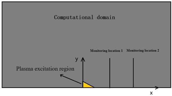 In order to validate the developed plasma mathematical model, the discharge process of the plasma in stationary air was simulated. The plasma was placed at the center of the computational domain (), and two monitoring points were placed downstream at and to measure the induced jet velocity in the x direction. The overall calculation domain had a height of 12 cm and a length of 20 cm, and the temperature was set to 20 °C. The gas density and viscosity were set to and , respectively. To match the peak voltage in the experiment (i.e., ), the plasma intensity parameter () was set to 0.7 during the validation process. In the numerical simulation, the flow field initialization velocity was set to . This facilitated the observation of the disturbance effect of the plasma on stationary air. In addition, it allowed for matching the phenomena in the test, which demonstrates the high accuracy of the plasma mathematical model. A schematic of the entire calculation domain is shown in Figure 4.