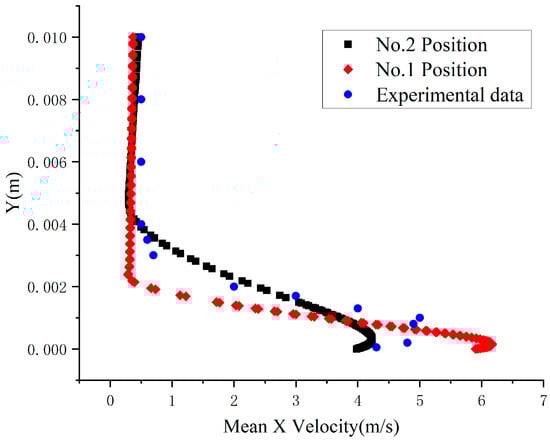 The computed time-averaged x-direction velocity distributions at the two monitoring points were compared with the measured values in [22]. The obtained results are shown in Figure 5, where the calculated peak-induced jet velocities at positions and are 4.1 m/s and 6.2 m/s, respectively. The experimentally measured peak-induced velocity in [22] was 5.3 m/s, which falls between those measured at the two monitoring points. Compared to the position of the experimental peak velocity, the computed peak velocity was closer to the wall. Therefore, it is considered that the developed plasma mathematical model is reasonable.