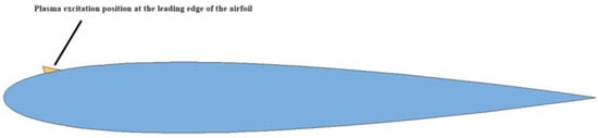 In this section, the static stall characteristics of the NACA0012 airfoil under plasma excitation are studied based on the mathematical model of the AC DBD plasma excitation and the numerical simulation method of the airfoil flow field. This allows for analyzing the impacts of the plasma excitation intensity and excitation position on the aerodynamic coefficient of the airfoil. Afterward, considering the aerodynamic environment of the rotor blade profile during rotor operation under variable inflow and angle of attack conditions, the impact of the plasma excitation position on the control of the dynamic stall is studied, and the mechanism of plasma excitation control over dynamic stall is analyzed. The plasma excitation was applied on the upper surface of the airfoil leading edge, as shown in Figure 6.