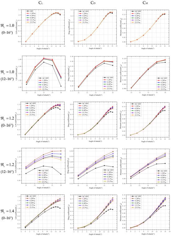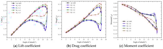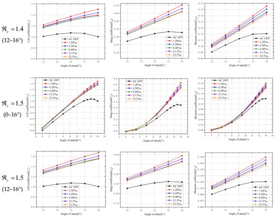 It can be observed in Figure 9 that without plasma excitation, the lift coefficient of the airfoil significantly decreased, and its hysteresis loop area was larger after an angle of attack of 16.5°. For values of 1 and 1.2, the maximum lift coefficients of the airfoil slightly increased, the hysteresis loop area slightly decreased, and the average drag coefficients slightly increased. When reached 1.4, the reduction in the hysteresis loop area of the lift coefficient became more prominent. Furthermore, when reached 1.5, the maximum lift coefficient of the airfoil significantly increased, the hysteresis loop area was significantly reduced, and the phenomenon of stalling was removed. Throughout this process, the average drag coefficient increased, the trend of change in the moment coefficient slowed down, and the significant abrupt aerodynamic changes no longer appeared.