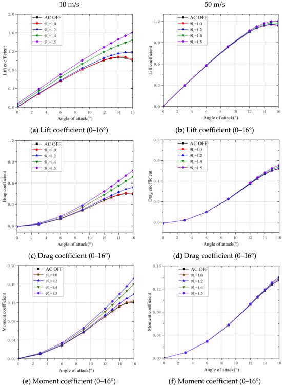 The aerodynamic force and moment coefficients of the airfoil under different plasma excitation intensities at various excitation positions were calculated at a constant incoming flow velocity. The freestream velocity and the range of angle of attack for the airfoil were set to 10 m/s and 0–16°, respectively. The plasma excitation was applied on the upper surface of the NACA0012 airfoil at 1.2%c, 4.2%c, 8.4%c, 15.3%c, and 23.7%c from the leading edge, where c is the chord length of the airfoil. The plasma excitation intensity parameters were set to . Figure 7 shows the aerodynamic force and moment coefficients of the airfoil calculated under the aforementioned conditions.