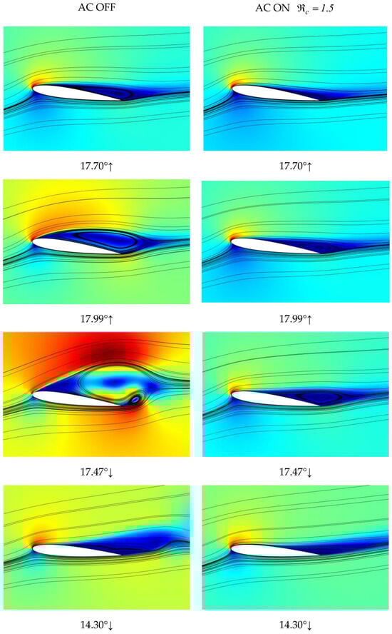 The underlying principle of plasma excitation in suppressing dynamic stall can be clarified by analyzing the streamline near the stall angle of attack (Figure 10). Without plasma excitation, when the airfoil reached the stall angle of attack, a large dynamic stall vortex was formed on the upper surface. The latter migrated from the leading edge toward the trailing edge and eventually shed, which resulted in a significant lift decrease. However, under the plasma excitation with an of 1.5, no evident dynamic stall vortex was observed on the upper surface near the stall angle of attack. This prevented the sudden lift decrease due to vortex shedding, which allowed for removing the dynamic stall and improving the aerodynamic environment.