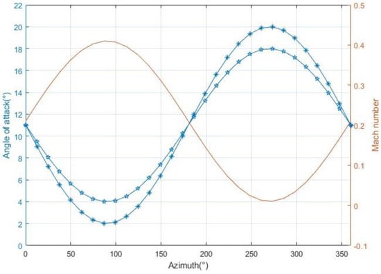 In practical applications, the rotor aerodynamic environment of a helicopter is very complex. However, for a blade profile, the aerodynamic environment can be viewed as varying periodically along the azimuth with the same manipulating inputs and the same flight conditions (Figure 11). In addition, at a given azimuth angle, the angle of attack and incoming flow velocity of the blade element remain unchanged. In this section, far-field grid deformation is employed to simulate the changes of the incoming flow velocity. Moreover, the rotation of the internal pitch domain is used to simulate the variation in the angle of attack in order to accurately simulate a realistic aerodynamic environment.