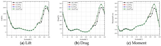 The large-angle periodic flapping of the blades of a helicopter rotor often leads to its deep stall, which exhibits different aerodynamic characteristics from mild stall. To simulate the condition of deep stall in helicopter rotors, the pitch angle of the airfoil was increased. The aerodynamic force calculations for the airfoil subjected to plasma excitation under deep stall conditions are presented in Figure 15 and Figure 16.