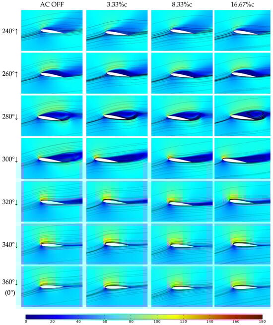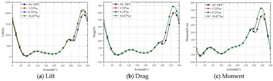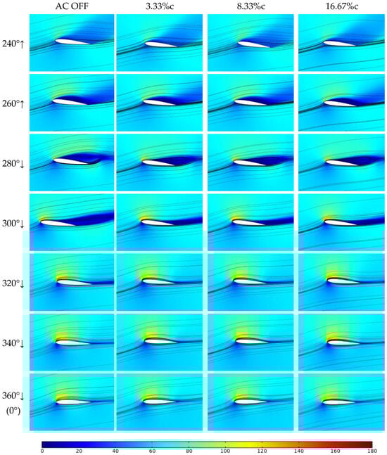 It can be seen in Figure 13a that under the condition of mild stall without plasma excitation (AC OFF), a dynamic stall occurred near the azimuth angle of 270°. The lift suddenly decreased from 750 to 650, while the curves of the drag and pitching moment became smoother in the vicinity of this azimuth angle. It can be observed in the AC OFF column of Figure 14 that at an azimuth angle of 260°, the airfoil continued to pitch up, and a large negative pressure zone appeared on its upper surface, which extended from its leading edge to its trailing edge. At an azimuth angle of 280°, the airfoil started to pitch down, the incoming flow velocity gradually increased, and a large dynamic stall vortex was observed to separate from the trailing edge of the airfoil on its upper surface. In addition, as this dynamic stall vortex detached, the lift, drag, and pitching moment curves returned to their normal trends. It can be observed in the aerodynamic force curve that the plasma excitation applied at three different positions effectively removed the sudden lift drop, drag, and moment hysteresis near the azimuth angle of 270°, and it attenuated the adverse effects of the dynamic stall on the aerodynamic forces. Moreover, turning on the plasma excitation between the azimuth angles of 0° and 260° did not alter the aerodynamic curve of the airfoil. This demonstrates that the plasma excitation had a very slight impact on the aerodynamic characteristics of the airfoil in the normal condition. It can be seen in Figure 14 that without applying the plasma excitation, there was a negative pressure zone with a large width range at the trailing edge of the airfoil at the azimuth angle of 300°. However, when the applied excitation was applied, this negative pressure region became very small, which indicates a significant improvement in the dynamic stall phenomenon.