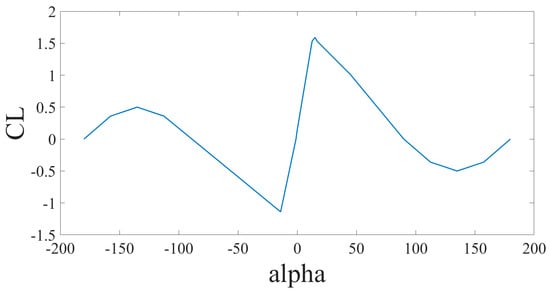 where is the air density, S is a reference surface, V is the relative velocity, is angle of attack, q is pitch rate, is the angle of attack change rate, and is the Elevator deflection angle. The coefficients , , and are constants depending on the aerodynamic configuration. , is the dimensionless angular velocity. The relationship between and is in Figure 2.