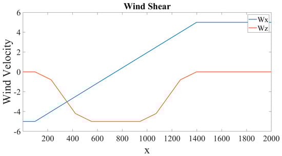 The model describes that the horizontal wind field is related to the horizontal displacement x of the aircraft, while the vertical wind field is related to both the horizontal displacement x and the vertical displacement h of the aircraft. k characterizes the maximum wind speed of wind shear and is a reference altitude. The specific model is as follows: