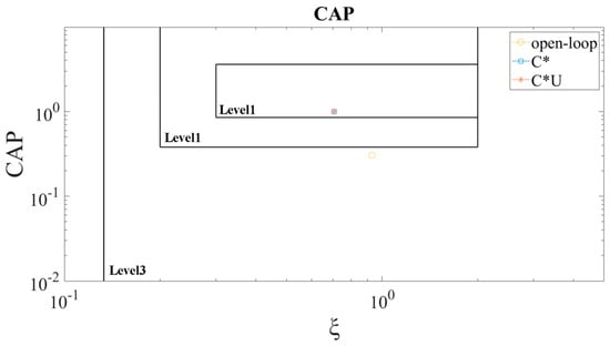 According to the CAP calculation formula, , , and , which is shown in Figure 7. The short-period and phugoid modals of the open-loop aircraft are classified as level 3, and the aircraft where the C* and C*U control laws are employed are both classified as level 1.