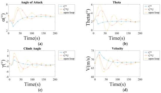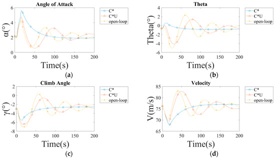 After 500 s from the start of the simulation, both the aircraft without the controller and the aircraft with the C*U controller basically stabilize, and there is not much difference in their values. The steady-state values can be seen in Table 10 and Table 11.