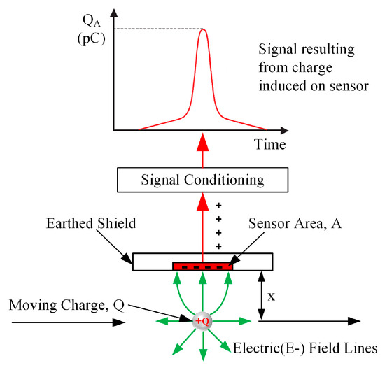 Figure 1 depicts the charge detection process in an electrostatic sensor as a moving charge particle traverses the sensor’s surface [36]. When the charged particle passes across the surface of the electrostatic sensor, electric (E-) field lines due to the charge (+Q) terminate on the sensor face. The electrons in the sensor redistribute to balance the additional charge in the vicinity of the sensor, inducing opposite charges and resulting in a current flow, which is measured by a conditioner. The signal conditioning transforms the observed charge into a proportionate voltage signal that is collected and analyzed [37].